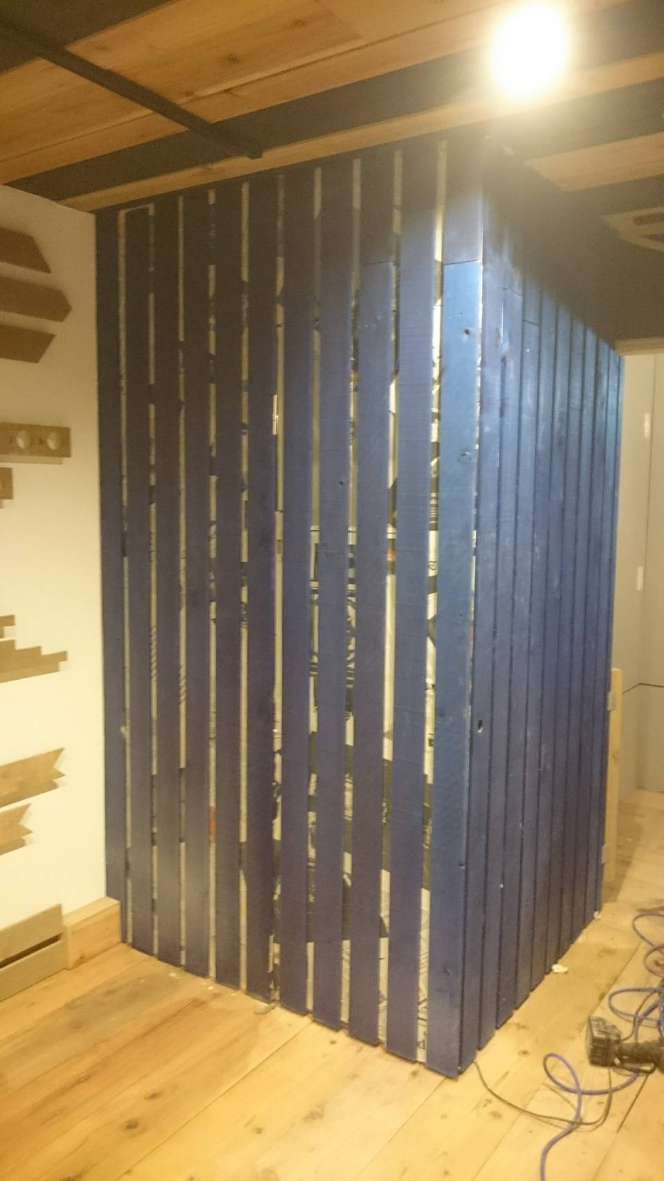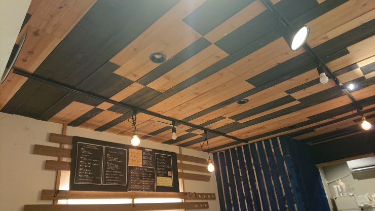 写真は天井のタイルです。木色と青色のバランスは心地よいようにつくってます。